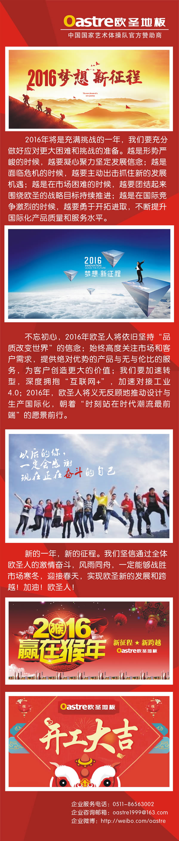 尊敬的客戶,感謝您一直對歐圣地板的信任和大力支持,值此春節來臨之際,歐圣地板對您表示最誠摯的祝福和最衷心的感謝。在歐圣地板的發展歷程中,您,尊敬的客戶,是您慷慨地給予了我們強大的力量,我們在2015年再次成為了中國地板十大品牌;是您賦予了我們不斷前進的動力,讓我們能夠在2015年蓬勃發展,是您毫不吝嗇地給予了我們關注以和信賴,讓我們能夠在未來朝著歐圣人夢想的…