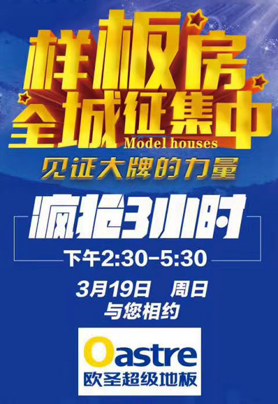 經過近兩周縝密的活動布置、宣傳,3月19日,宿遷市義務商貿城歐圣地板專賣店,“見證大牌的力量”歐圣地板瘋搶3小時活動終于完美落地。在2月18日的大型活動剛剛結束不久,宿遷營銷中心便開始策劃活動,力爭做好此次“見證大牌的力量”歐圣地板瘋搶3小時活動。同時,我們也不遺余力的通過市場廣告、戶外廣告上加大宣傳力度,連續的市場外圍重要位置的巨幅宣傳畫面;全市重要小區…