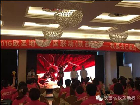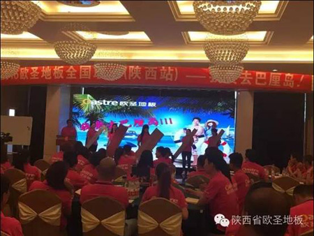 2016年5月9日-10日,“6月10日全國瘋搶歐圣地板活動陜西站經銷商誓師大會暨新品推介會”隆重召開,來自全省的百余名經銷商代表匯聚一堂。本次會議分為形象店參觀、新產品推介、6月10日全國瘋搶歐圣地板活動陜西站啟動宣講和培訓四大部分,出席會議的有江蘇歐圣木業有限公司總經理莊開鋒先生、江蘇歐圣木業有限公司營銷部李華賓部長、陜西圣澤偉業商貿有限公司總經理袁俊杰及副總經理朱奎香等各部門負責人。