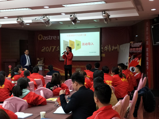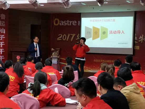 精彩的風(fēng)采展示后,歐圣地板陜西營(yíng)銷中心總經(jīng)理袁總對(duì)于本次活動(dòng)做開場(chǎng)詞,對(duì)2017歐圣地板的發(fā)展趨勢(shì)進(jìn)行分析。