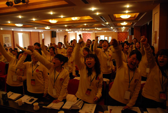 11月12日,來自全國各地的優秀導購員代表陸續齊集江蘇丹陽丹亞大酒店。13日清晨,天氣雖寒,但歐圣的優秀導購員代表們熱情仍然高漲。有的代表們13日凌晨才趕到酒店,有的甚至遇到大雪封路,他們也不顧疲勞,抖擻精神,很快便投入到了培訓的隊伍中。從組織到準備,總公司領導都非常重視,歐圣木業集團總經理王瑾女士、總經理助理尹萍女士、營銷總監毛偉先生也親臨培訓現場,參加了本次參觀交流活動。13日上午8時,在王總充滿激情的開幕詞中,2009歐圣地板第二屆全國優秀導購員代表培訓會隆重舉行。