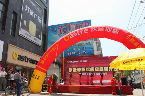 2010年5月29日上午,潤宇市場歐圣旗艦店門口彩球飄揚,多名身著紅色旗袍,手拿歐圣宣傳傘的禮儀小姐在門口整齊排開,從市場門口一直延伸到店門口,整個廣場彌漫著歐圣的氣息,再加上印有公司特有榮譽的精美拱門和門口搭建的舞臺,氣勢咄咄逼人!